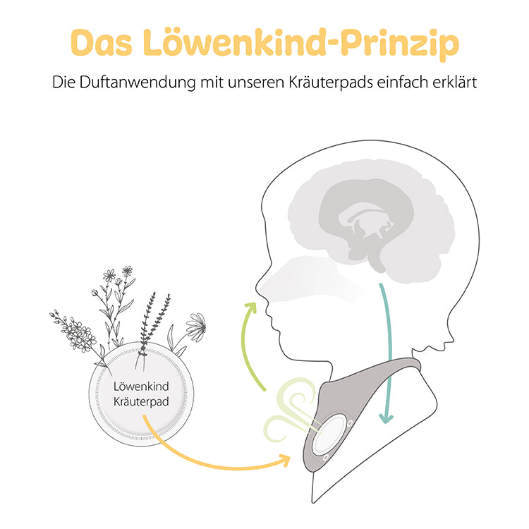 Das Kräuterpad wird ins Löwenkind Halstuch ­gesteckt. Dank der Körperwärme wird der Duft der Kräuter verstärkt.