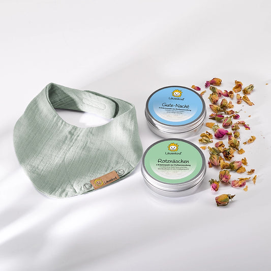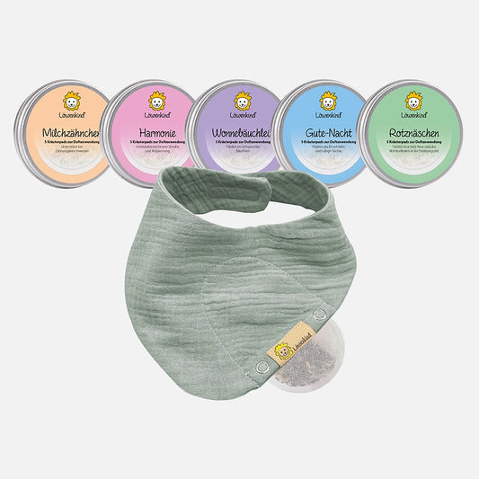Das Kräuterpad wird ins Löwenkind Halstuch gesteckt. Dank der Körperwärme wird der Duft der Kräuter verstärkt.