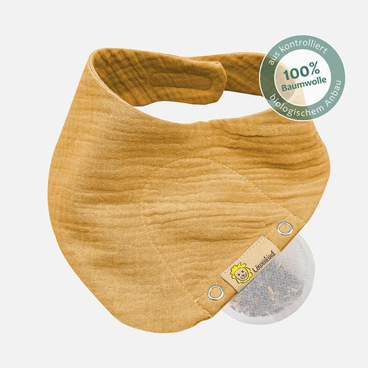 Das Kräuterpad wird ins Löwenkind Halstuch gesteckt. Dank der Körperwärme wird der Duft der Kräuter verstärkt.