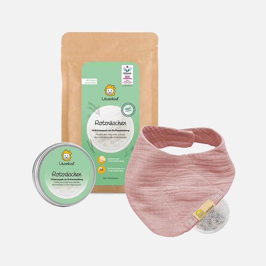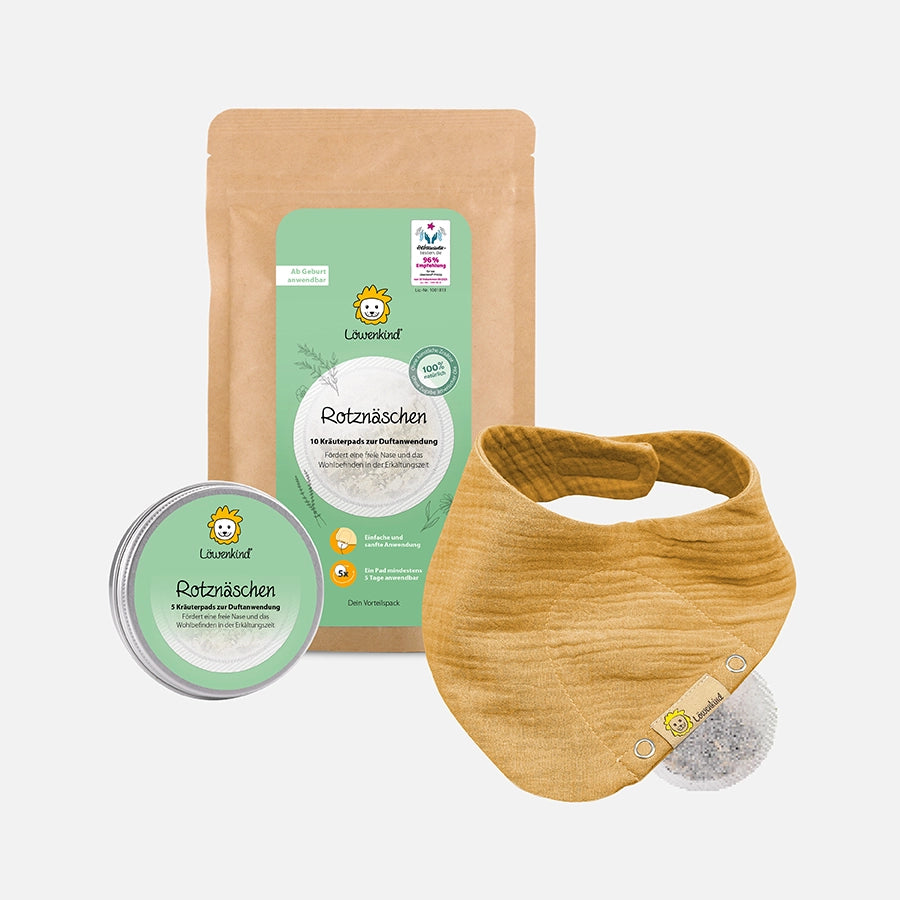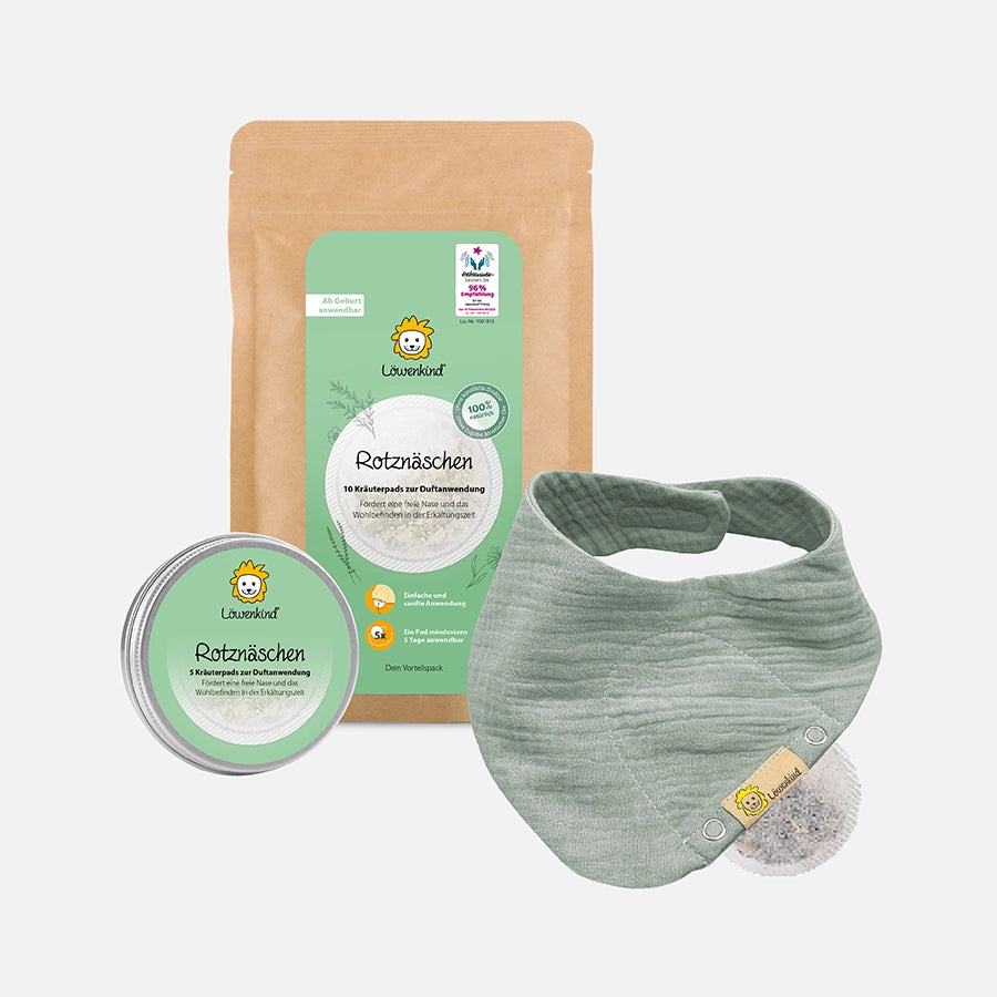 Das Rotznäschen-Special ist der ideale Begleiter in der Erkältungszeit. Mit dem Musselin-Tuch und den 15 Kräuterpads bist Du optimal vorbereitet.