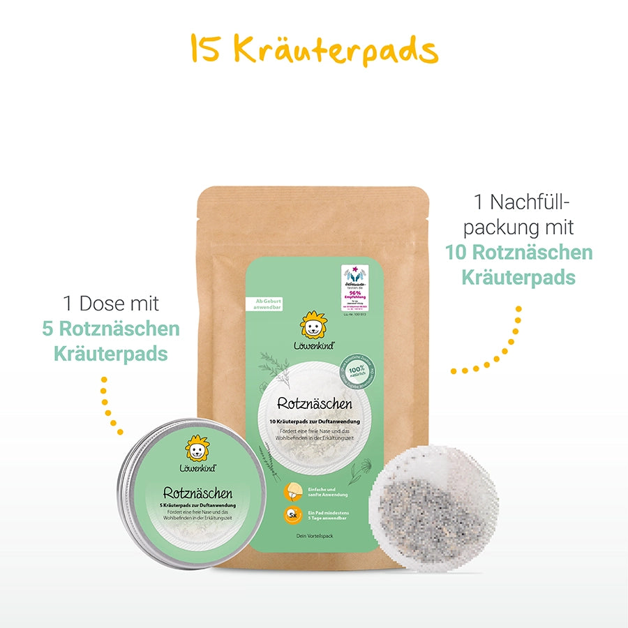 - Es sind 15 Rotznäschen-Kräuterpads enthalten