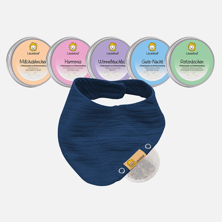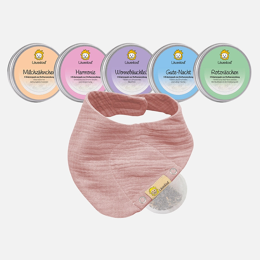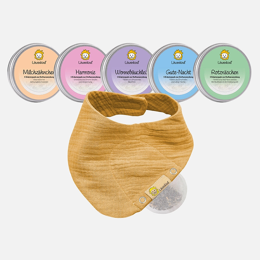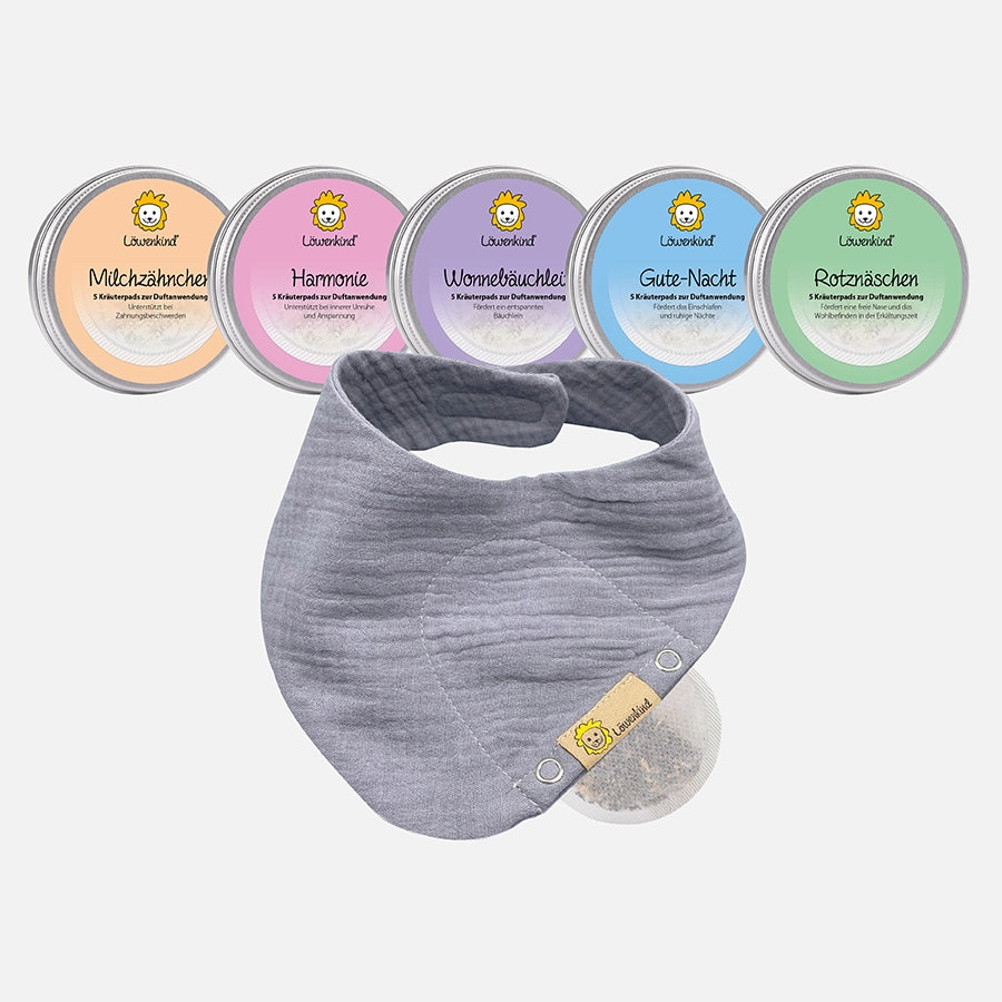 - Musselin-Halstuch Mini (0-4 Jahre) mit integrierter Tasche für die Kräuterpads + 5 Kräuterpad-Dosen (je 5 Kräuterpads), ab Geburt geeignet