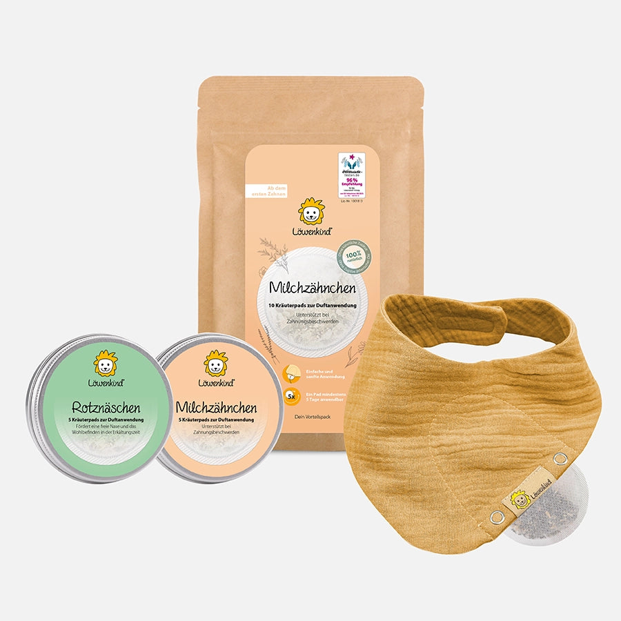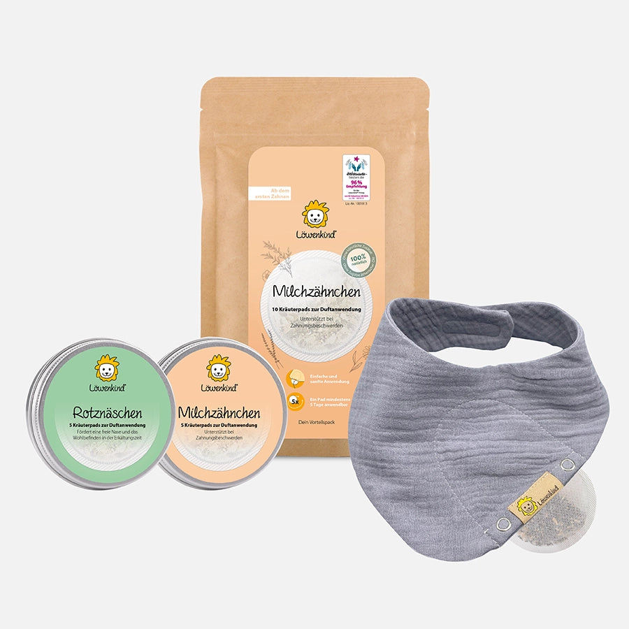 Geheimtipp beim Zahnen! Das Set enthält eine Milchzähnchen-Dose + 10er Nachfüllpackung, eine Rotznäschen-Dose, sowie das Musselin-Mini Halstuch (0-4 J.).